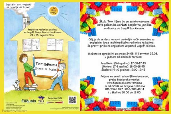 Organizujemo besplatne radionice sa Lego® kockicama za sve potencijalne polaznike. Želimo da na zanimljiv način zainteresujemo decu za učenje engleskog jezika. Radionice će se održati 24. i 25. avgusta 2016. godine i zato nas pozovite, ili se prijavite putem email-a ili naše Facebook stranice.